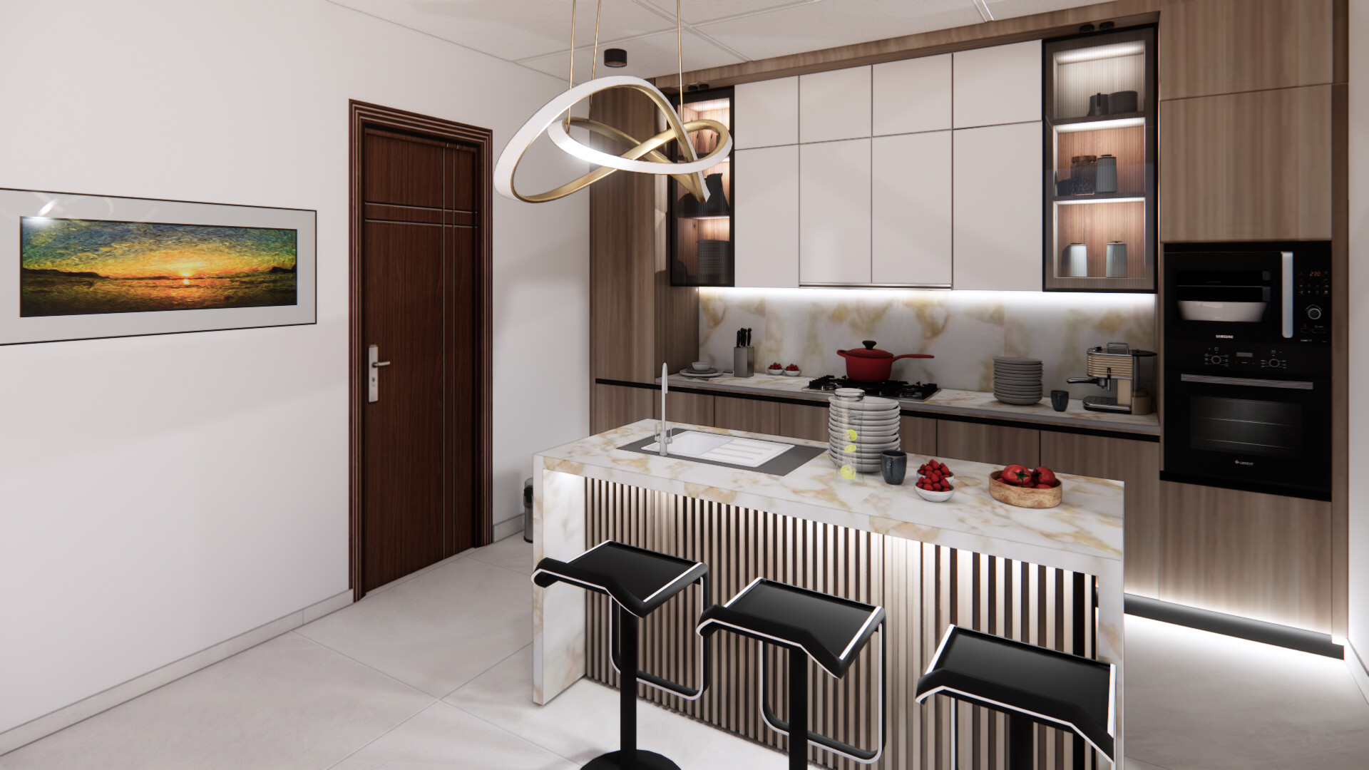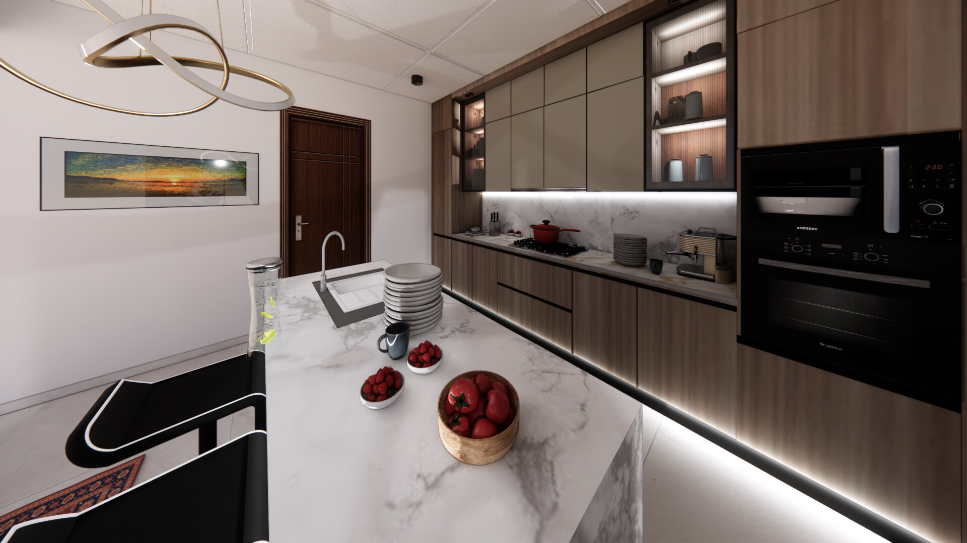 - White marble backsplash with LED lighting