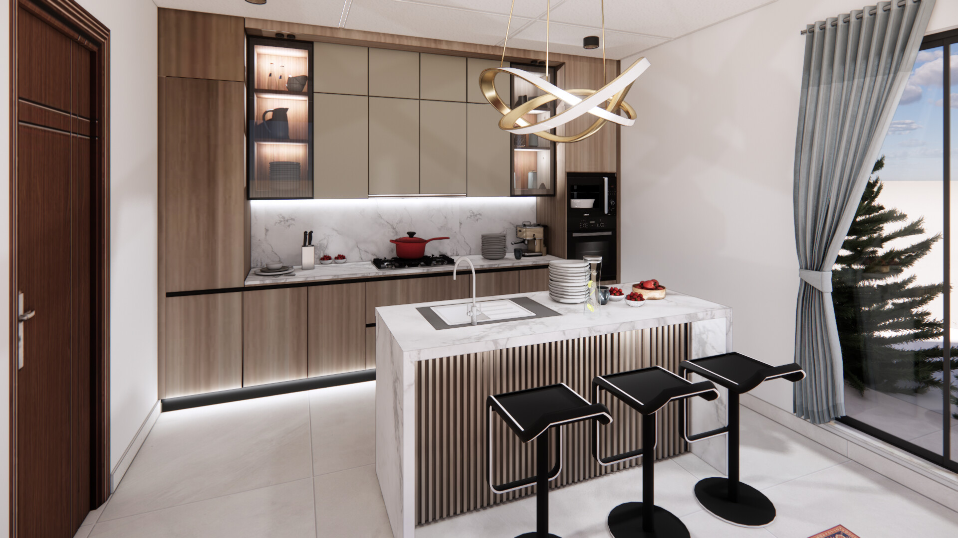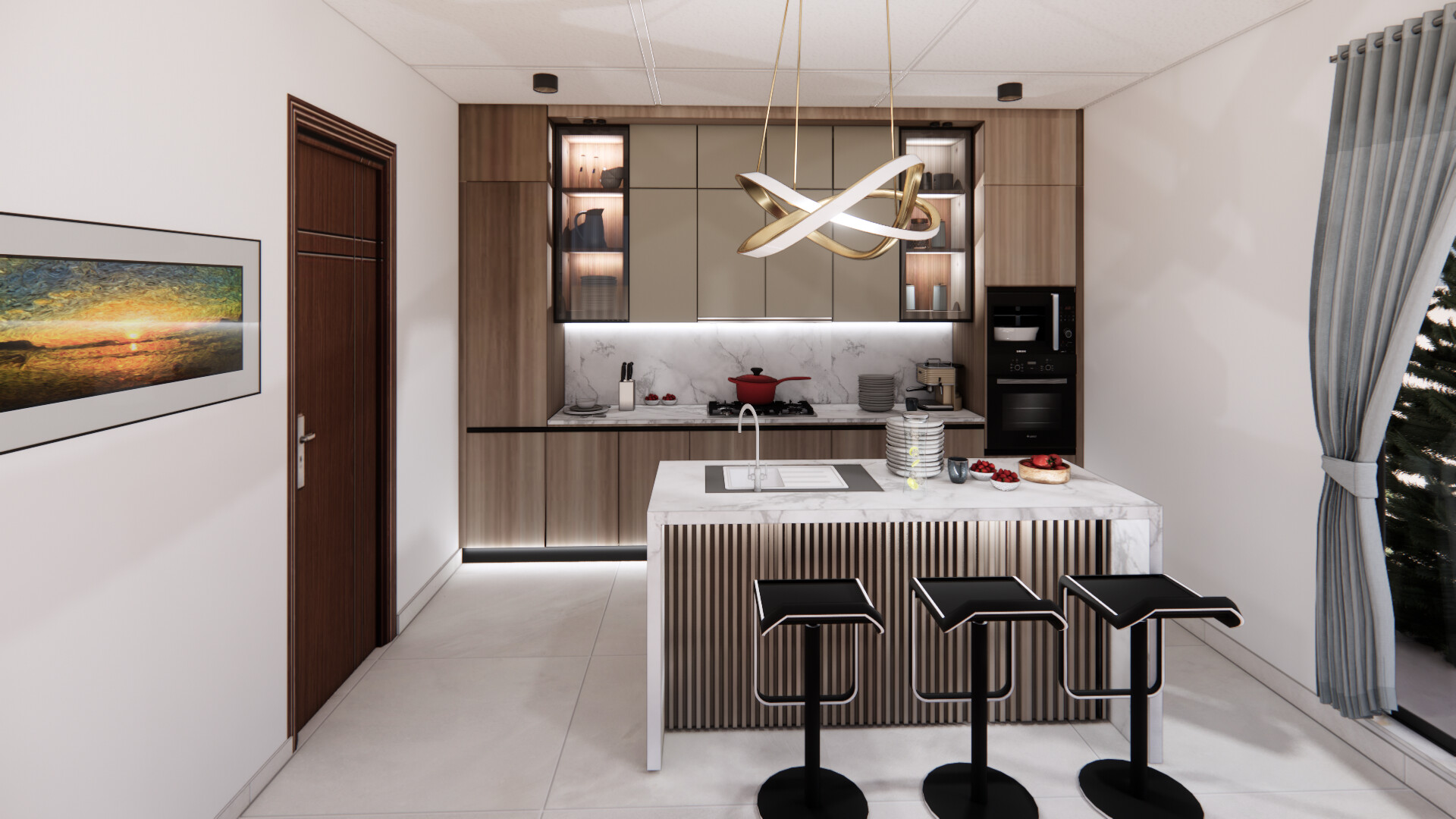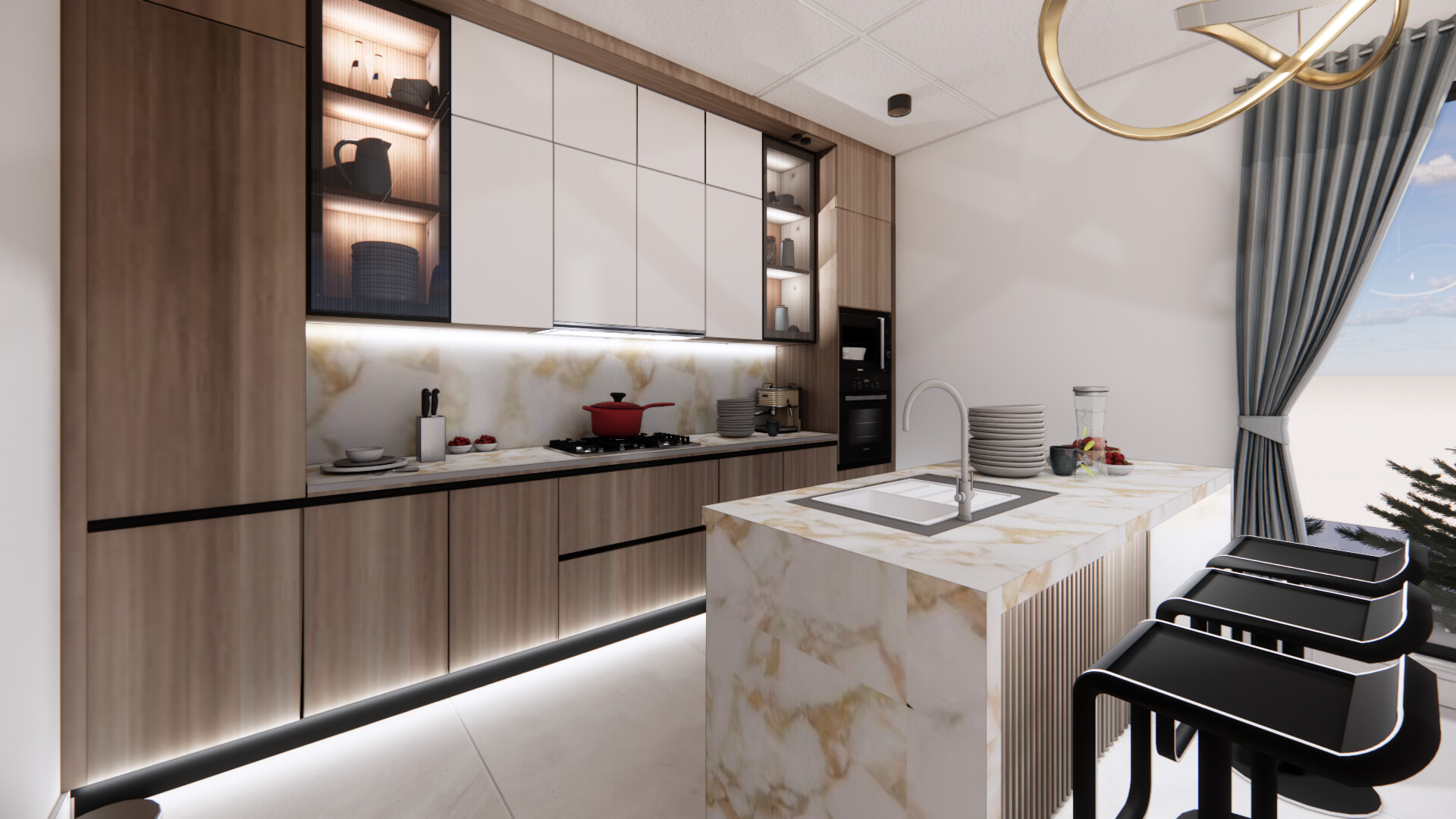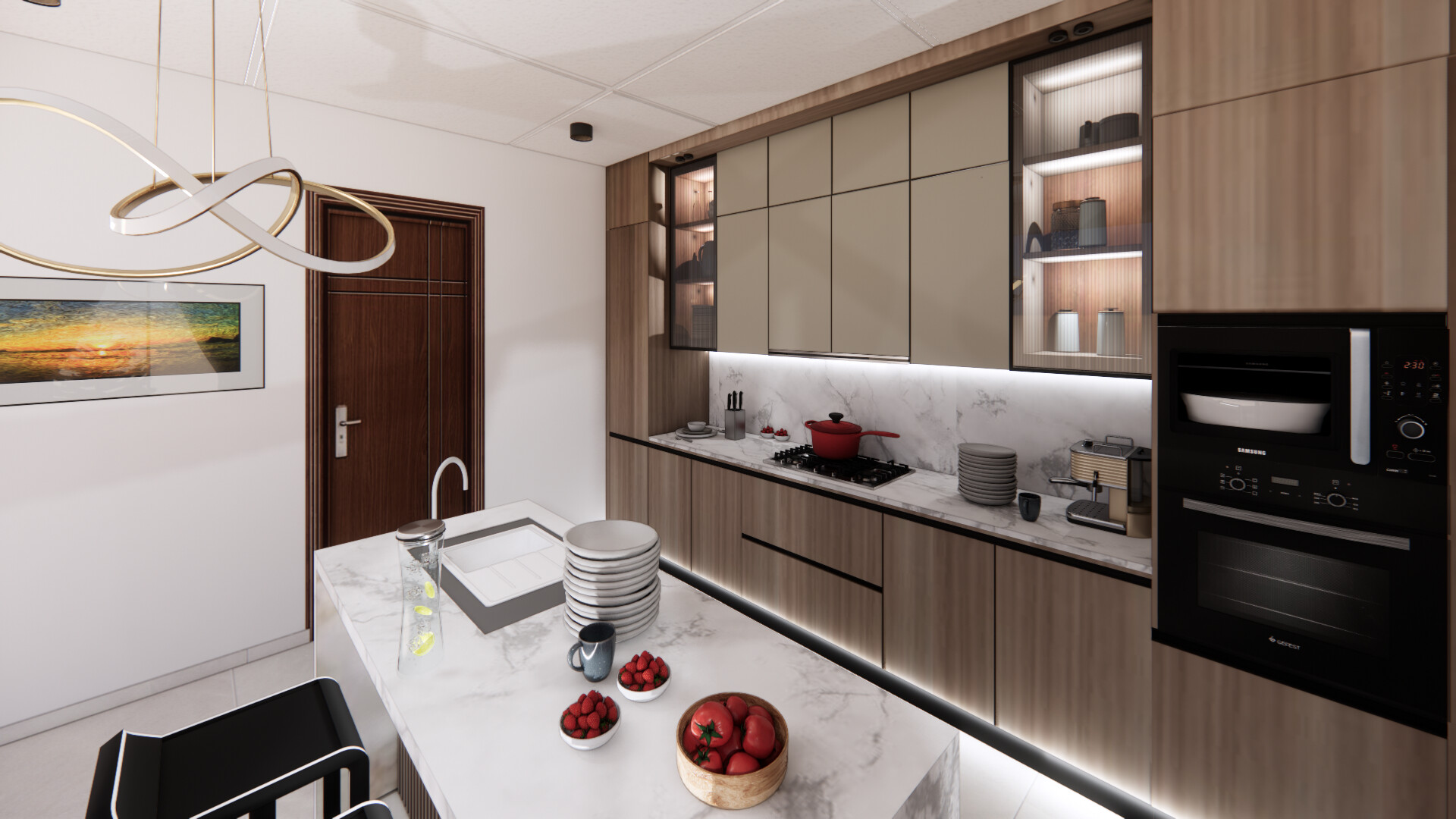Modern Walnut and Taupe with Marble Island
